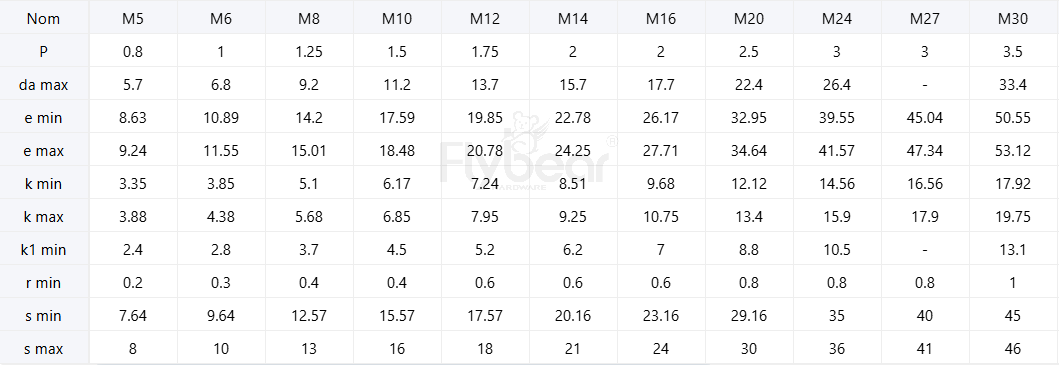 头部高度(k)参数示例:M5(3.88~3.35) M6(4.38~3.55) M8(5.68~5.10) M10(6.85~6.17)